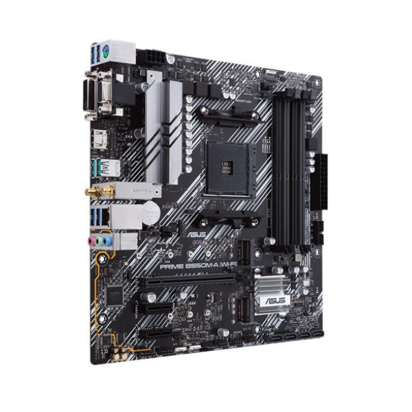 La ASUS Prime B550M-A II (WI-FI), au format Micro-ATX, est conçue pour exploiter pleinement les processeurs AMD Ryzen™ (séries 5000/3000). Elle intègre un slot PCIe 4.0 pour des cartes graphiques et des SSD ultra-rapides, ainsi qu’un double emplacement M.2. La connectivité est ultra-rapide grâce au Wi-Fi 6 (802.11ax) et à l’Ethernet 1 Gb, complétés par des ports USB 3.2 Gen 2 Type-A, assurant des transferts de données rapides et une expérience en ligne stable pour le travail ou le jeu.