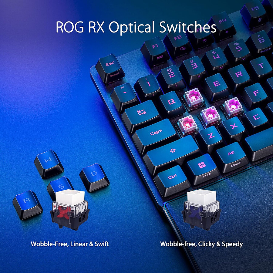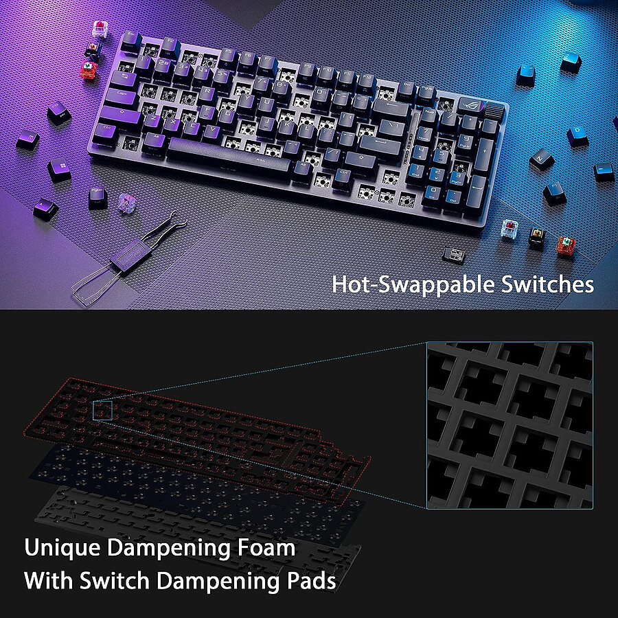 Plongez dans l’ambiance avec le Rétroéclairage RGB individuel par touche, personnalisable via Aura Sync. Cet éclairage dynamique ajoute non seulement un style agressif, mais aide aussi à identifier rapidement les touches dans l’obscurité. De plus, le clavier est équipé d’une mousse amortissante intégrée et de stabilisateurs ROG optimisés pour offrir une acoustique de frappe agréable et sourde, améliorant le confort lors des sessions de jeu prolongées.